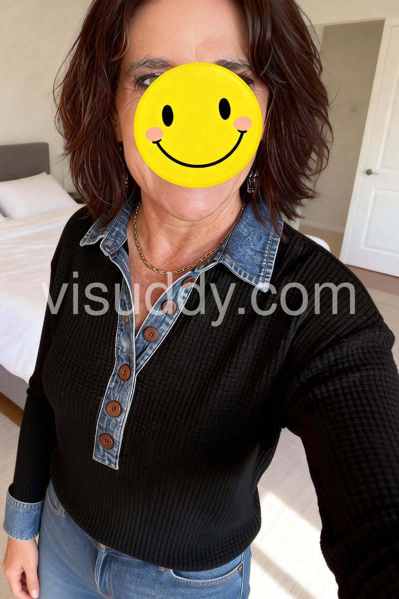 Cool Long Sleeve Denim Collar Button Front Top