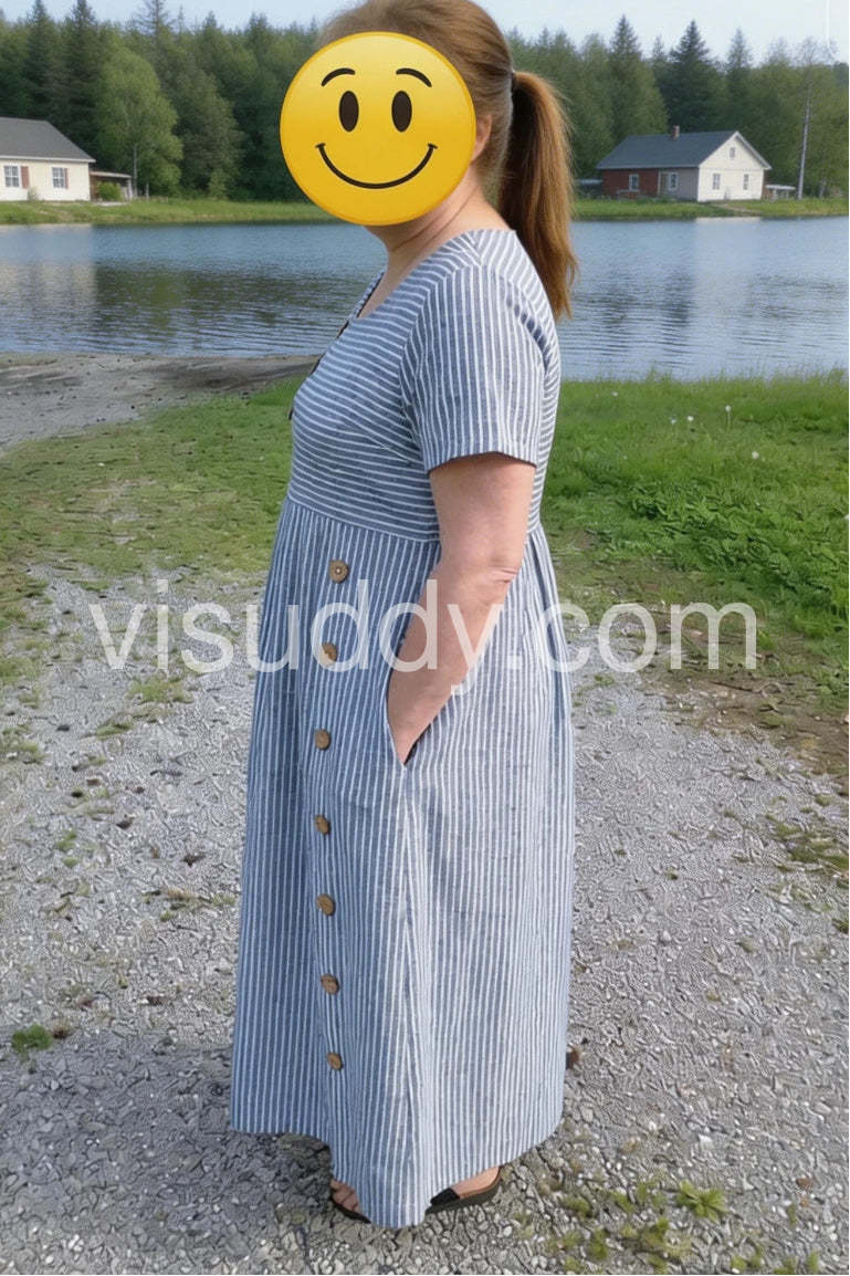 This dress is absolutely perfect! The blue and white stripes are so classic and the buttons add a nice touch.