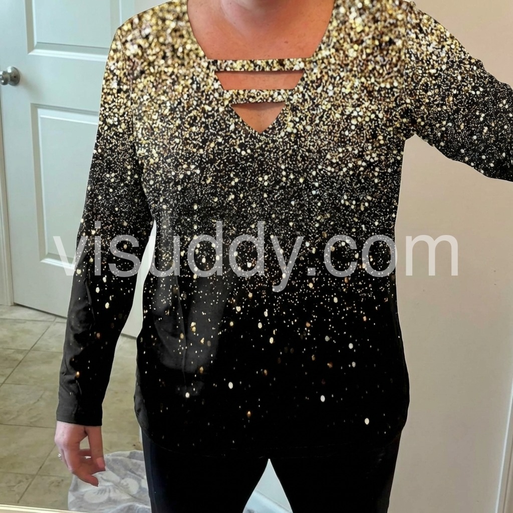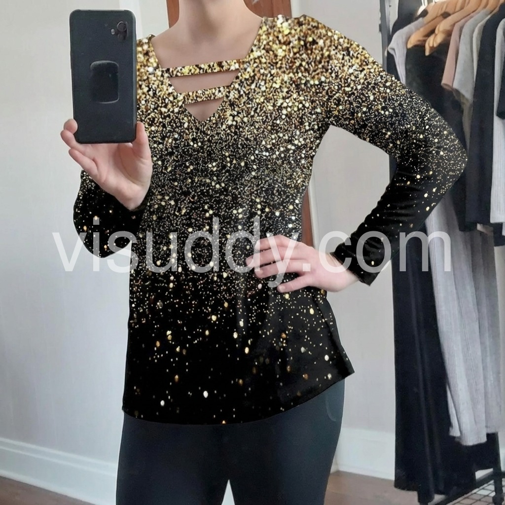 Just in time for your next glam holiday vacay! This sultry, strappy caged shirt has a v-neckline that awaits your favorite layering necklaces or statement jewels. This unique long-sleeved top sparkles with a generous sprinkle of metallic ombre silver and gold print, perfect for pairing with jeans or black slacks, boots, and metallic heels. Machine wash cold tumble dry low to medium heat. Iron if needed or lay flat to dry.