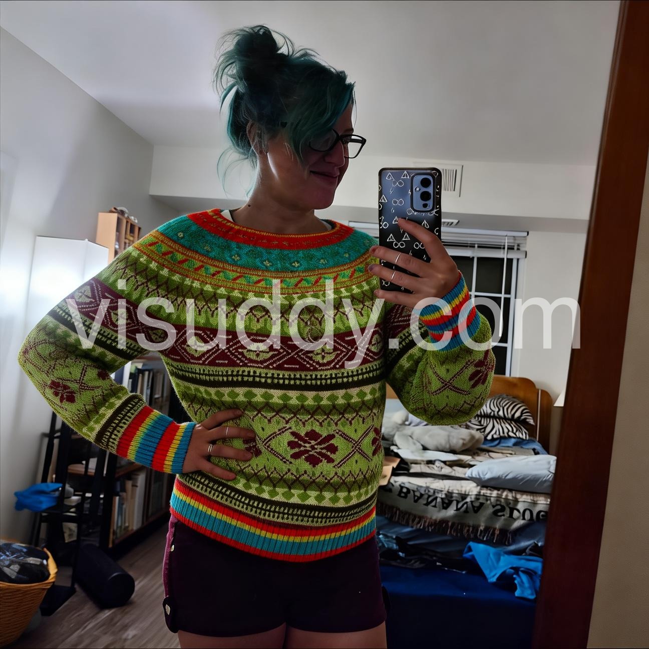 This sweater is such a fun and vibrant addition to my wardrobe! The mix of bright lime green, deep burgundy, and pops of turquoise in the classic fair isle pattern is so eye-catching—you can’t help but smile when you put it on.
