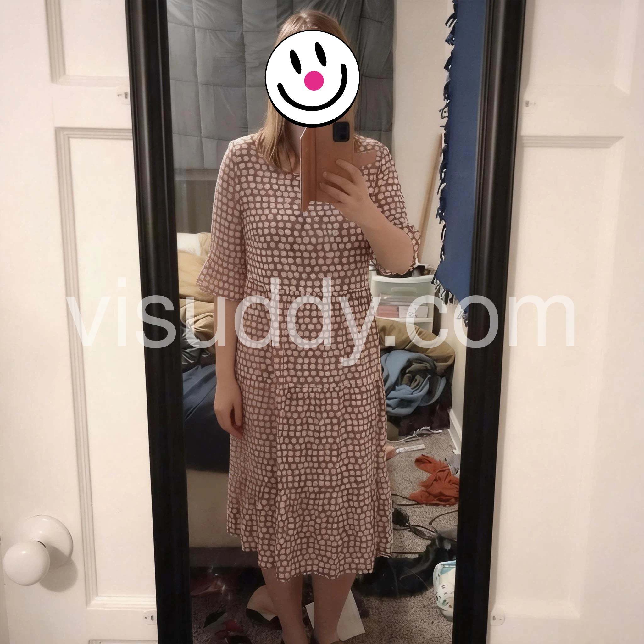 Exceeded my expectations! The color is a gorgeous neutral, and the polka dots give it a fun pop. True to size and a very forgiving and comfortable cut.