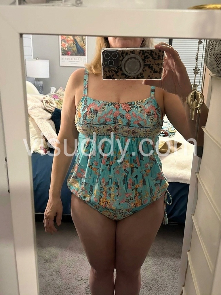 5'5 150lbs 70 year old Medium Bathing suit ... great material, hides stomach area well with style