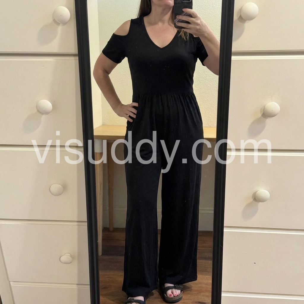 I absolutely love this jumpsuit! The cold shoulder design adds such a cute touch, and the wide legs make it incredibly comfortable. Plus, it has pockets! I wore it on a date night and got so many compliments. Highly recommend!